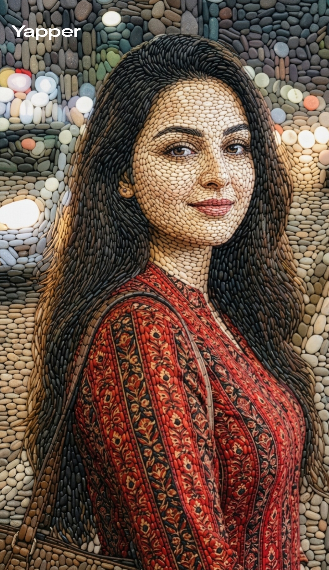 highly detailed pebble mosaic portrait of a beautiful woman, where the entire image is constructed from thousands of smooth natural stones and pebbles. The pebbles vary in size and color to form realistic facial features, hair, skin tones, and clothing patterns. The woman has long flowing hair and is wearing a richly patterned red traditional dress. The background is also composed of carefully arranged river stones creating a textured mosaic wall. Ultra-detailed stone texture, natural earthy colors, soft lighting, artistic stone mosaic craftsmanship, gemini photorealistic composition, 8k resolution, intricate pebble placement, handcrafted mosaic art style.