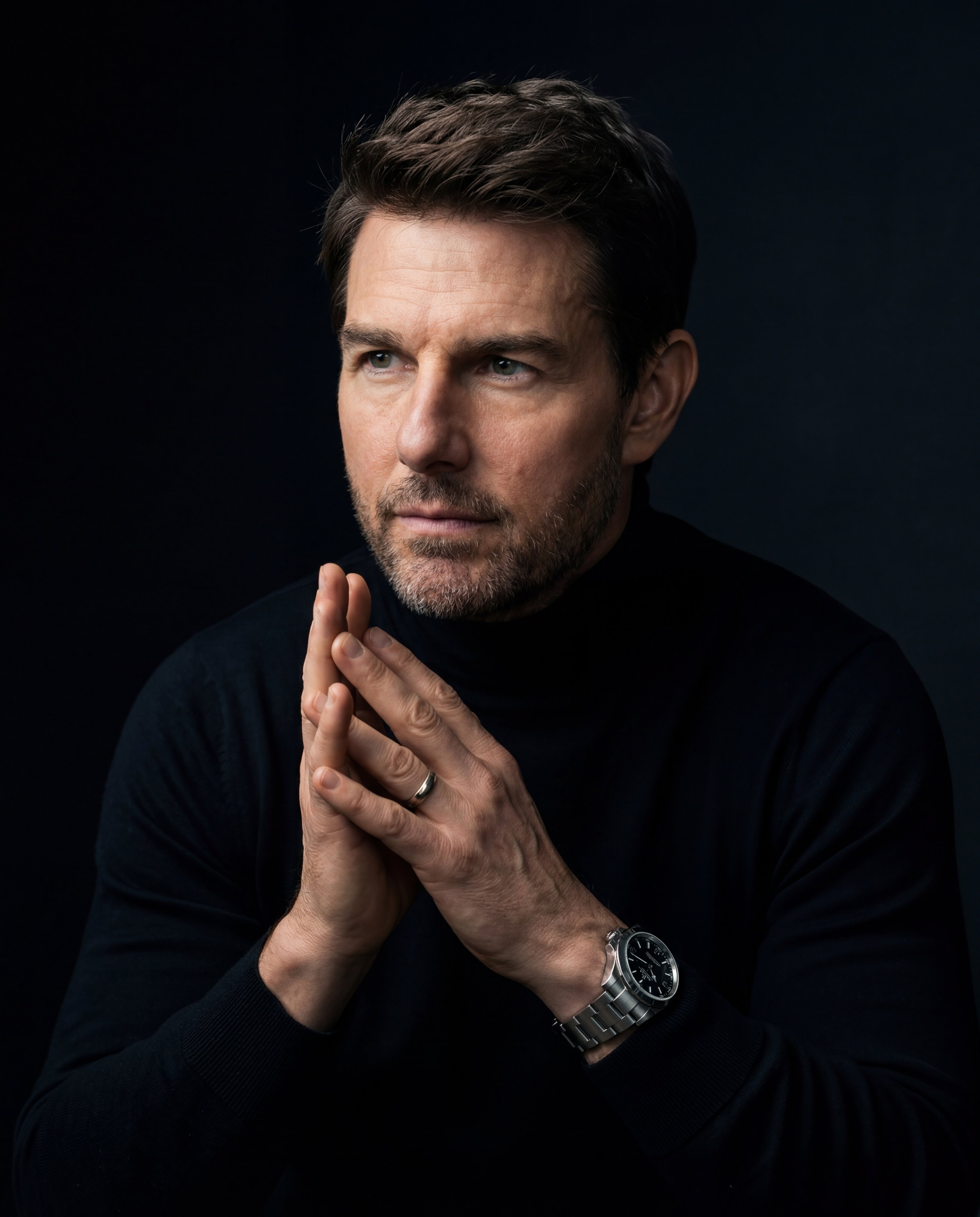 A hyper-realistic cinematic portrait of a man with short, textured hair and a well-groomed stubble beard, captured in a dark, moody 'night mode' aesthetic. The man is sitting in a contemplative pose, hands clasped together near his chest, fingers interlaced, with his gaze directed thoughtfully off-camera to the left. He is wearing a premium black high-neck turtleneck sweater and a silver-link luxury wristwatch on his left wrist, with a simple band on his right ring finger. The lighting is dramatic and controlled: a soft rim light outlines his silhouette against an almost pitch-black, shadow-drenched background, while a subtle, soft key light illuminates his face and hands. Shallow depth of field, 85mm portrait lens, ultra-sharp focus on the man's expression and clasped hands, with the chair in the background heavily blurred into complete darkness. Minimalist, professional, editorial photography, 4:5 aspect ratio, clean composition focusing strictly on the upper torso and face.