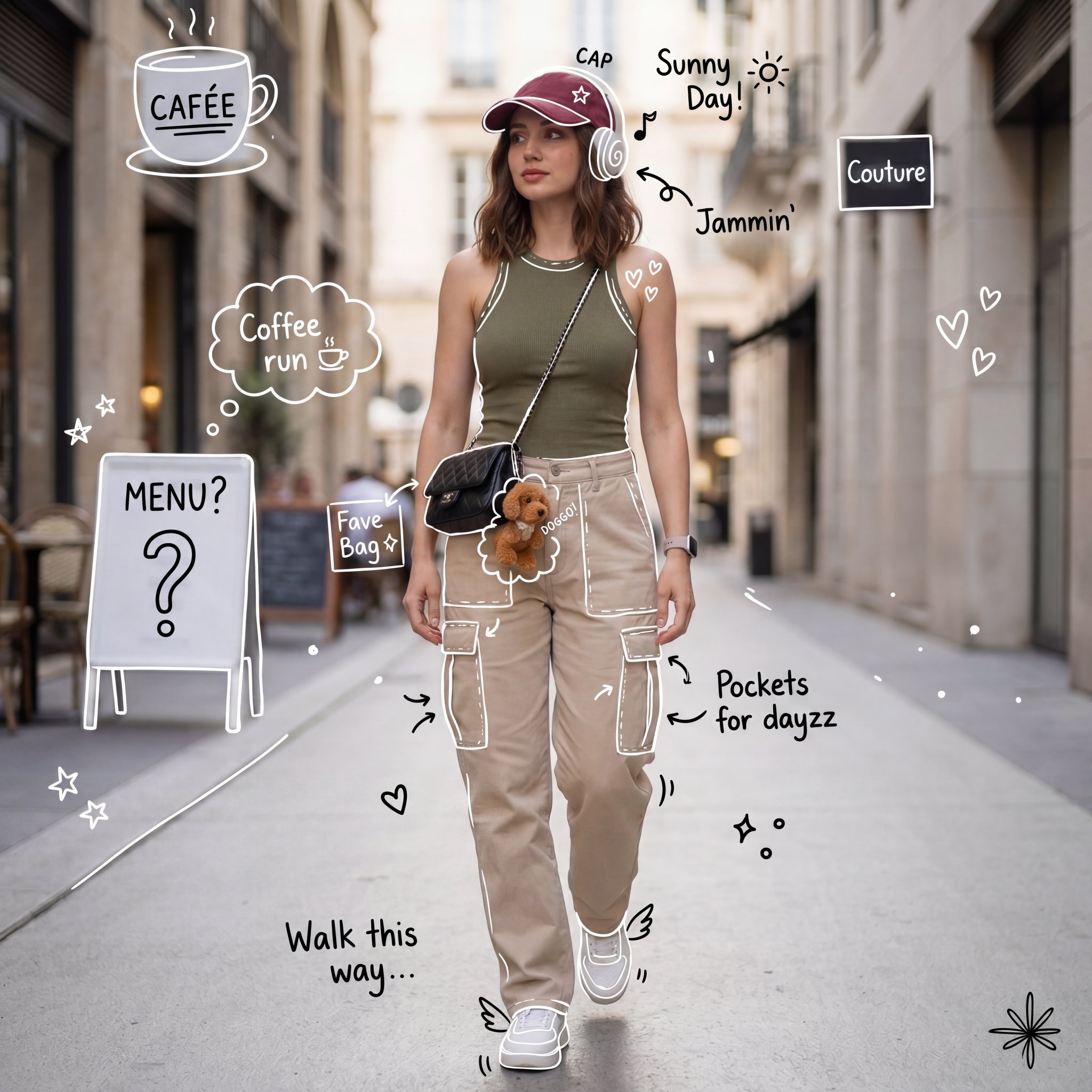 Add hand-drawn white doodles around objects, including outlines, swirls, arrows, and playful annotations. Use handwritten text in a casual, sloppy, and cute style, such as in notes and conversations. An aesthetic composition in the Instagram style, minimalistic but artistic. Keep it clean and reduce the amount of text. The text is in english