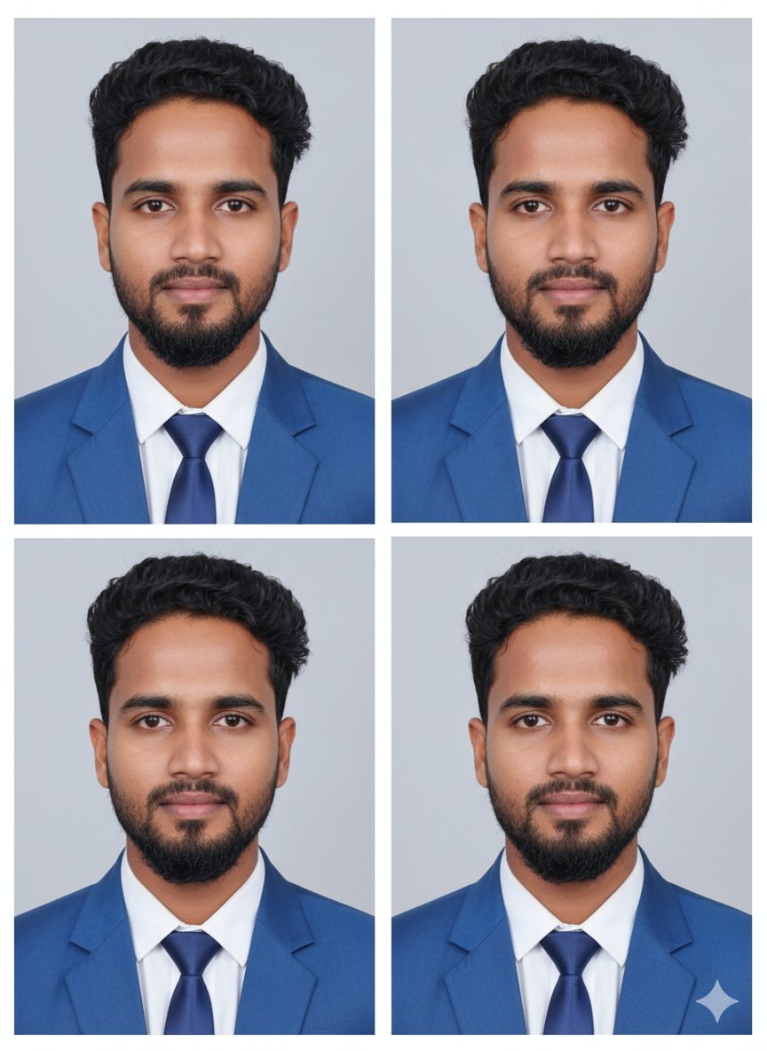 "Ultra-realistic passport-size photo of me (exact face likeness, 100% match, no facial changes).", "style": "Professional studio portrait suitable for official ID or passport use.", "outfit": "Blue casual suit and white coller shirt and matching tie with branded modern ", "expression": "Neutral closed-lip smile, straight look, both ears visible, shoulders included." 4 pis