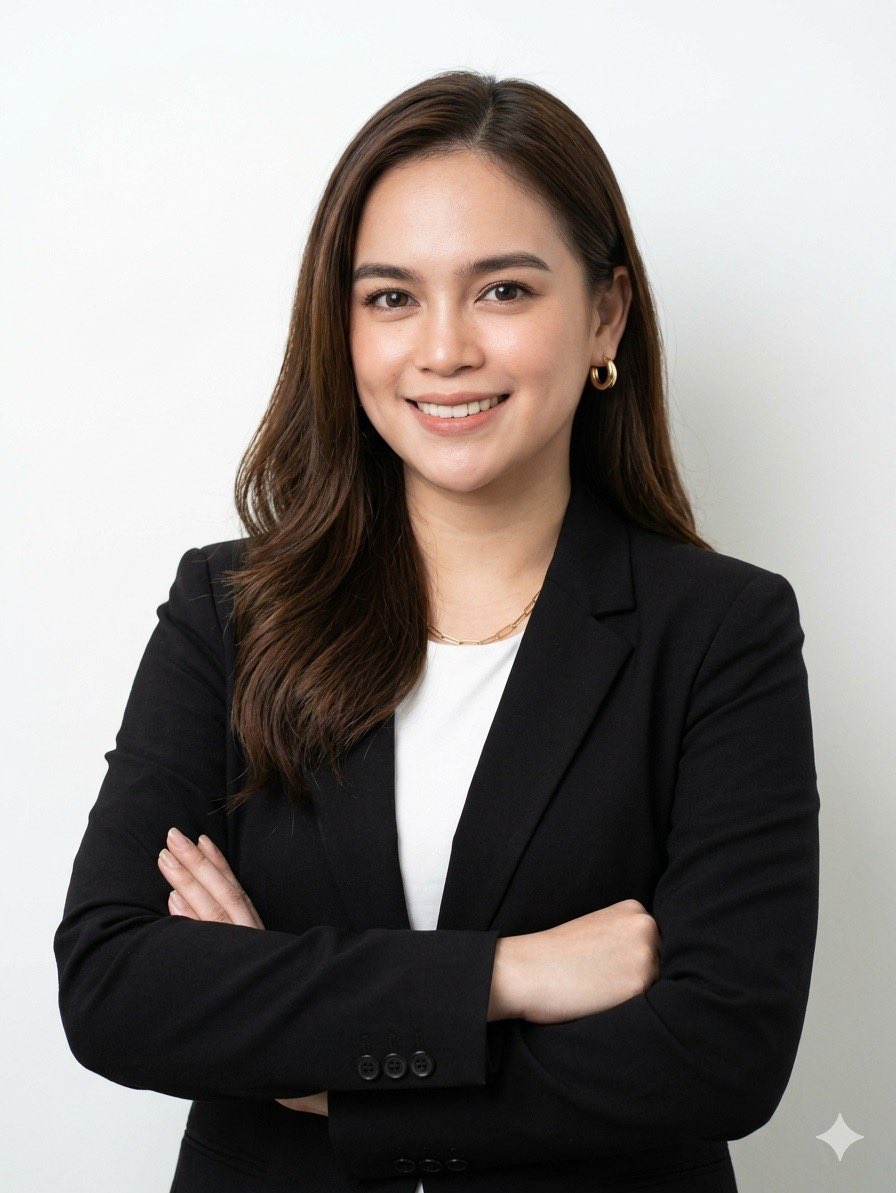 Create a realistic professional photo of a woman. Recreate the exact face from the attached image with natural skin tone and lifelike details. She is wearing a black business blazer over a white top, with long, slightly wavy hair styled neatly. She is standing confidently with arms crossed, smiling naturally. The background should be plain white with soft, even lighting. The image should look like a real high-quality corporate portrait taken by a professional photographer.