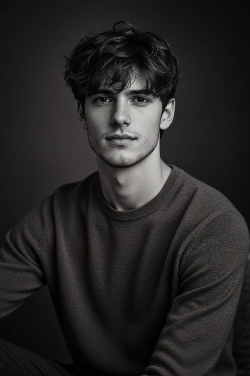 Ultra-detailed black and white studio portrait of a person, inspired by the dramatic, emotionally rich portrait photography style of Annie Leibovitz, tight medium close-up framing, subject seated with relaxed yet intentional posture, torso slightly angled 20 degrees away from camera, shoulders soft, head turned back toward camera, calm introspective expression, direct steady eye contact, camera positioned at eye level with slight proximity for intimacy, 85mm lens perspective, shallow depth of field with razor sharp focus on eyes and facial micro details, lighting setup: large soft key light from the side (45") sculpting facial features, gentle fill light to retain subtle shadow detail, soft controlled rim light separating silhouette from background, classic studio low-key contrast, smooth tonal transitions in grayscale, rich dynamic range from deep blacks to soft highlights, realistic skin texture with visible pores and natural imperfections (no plastic smoothing), fine hair strand separation, subtle catchlights in eyes, clothing: minimalist textured wardrobe (matte wool/cotton/silk) with visible fabric weave and natural folds, no distracting patterns, background: neutral dark studio backdrop with soft gradient falloff, slight vignette emphasizing face, micro film grain for analog realism, timeless editorial portrait aesthetic, museum-quality print look, high resolution, ultra sharp, cinematic monochrome tonality, emotionally charged and dignified atmosphere, 8k quality